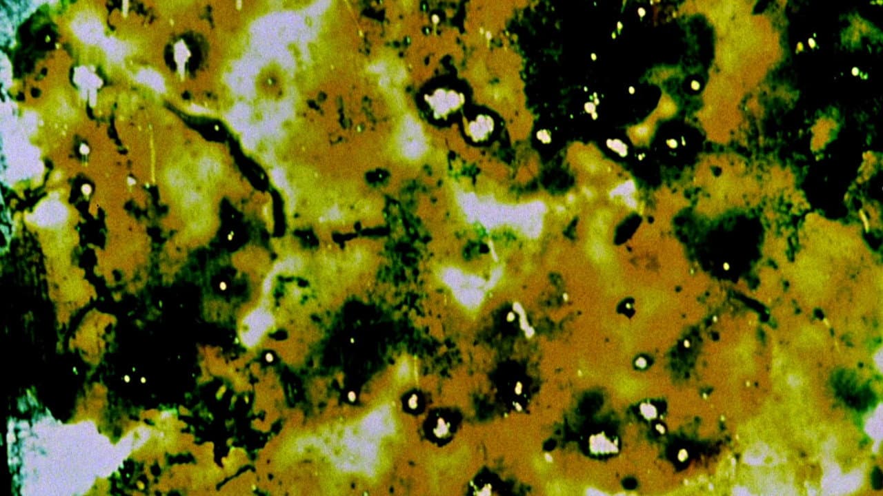 A hand-painted and photographically step-printed film, which exhibits variably shaped small areas of color (in a dark field) that explode into full frames of textured color interwoven with white scratch patterns that create a sense of interior depth and three-dimensional movement.