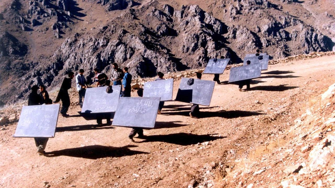 Itinerant Kurdish teachers, carrying blackboards on their backs, look for students in the hills and villages of Iran, near the Iraqi border during the Iran-Iraq war. Said falls in with a group of old men looking for their bombed-out village; he offers to guide them, and takes as his wife Halaleh, the clan's lone woman, a widow with a young son. Reeboir attaches himself to a dozen pre-teen boys weighed down by contraband they carry across the border; they're mules, always on the move. Said and Reeboir try to teach as their potential students keep walking. Danger is close; armed soldiers patrol the skies, the roads, and the border. Is there a role for a teacher? Is there hope?