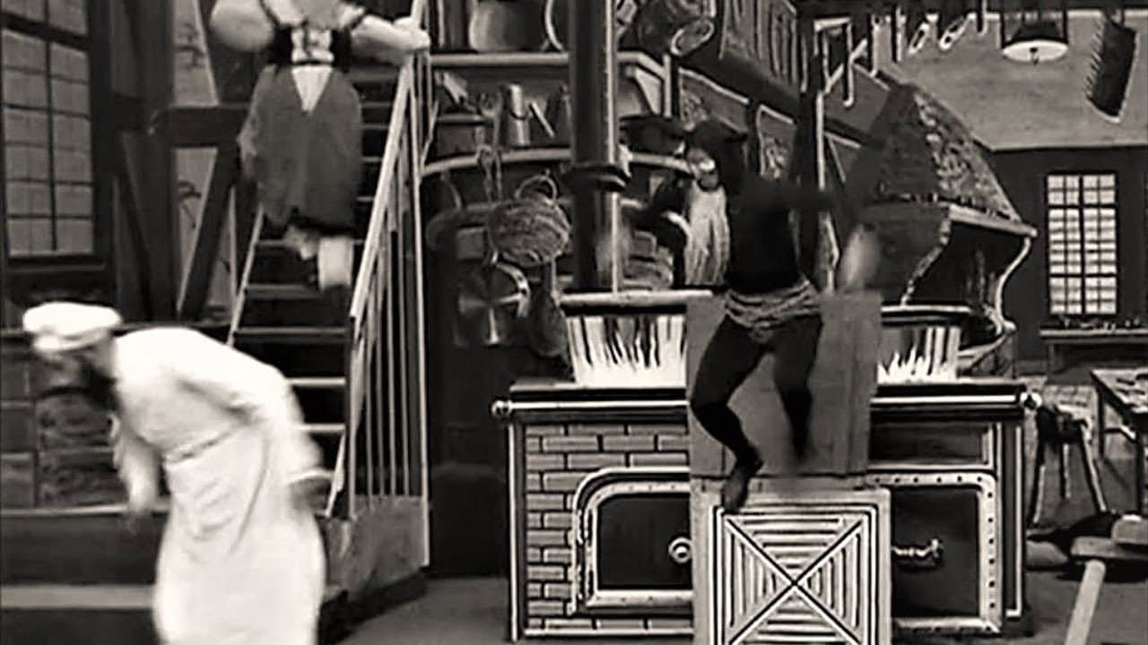A cook has his hands full with three mischievous devils, who pop in and out of his kitchen.