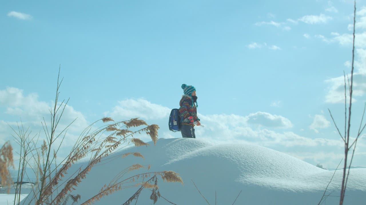 Snow covered mountains in Japan. Every night, a fisherman makes his way to the market in town. His 6 year old son is awoken by his departure and finds it impossible to fall back to sleep. In the sleeping household, the young boy draws a picture he then slips into his satchel. On his way to school, still drowsy, he strays off the path and wanders into the snow...