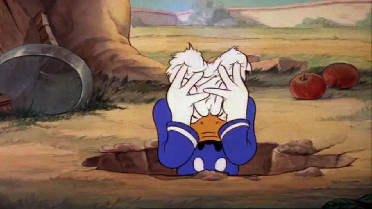 Donald hears a radio philosopher advise to laugh and count ten when he gets angry. He tries it successfully, then settles into his hammock for a nap. Between a caterpillar and the hen chasing it, he's soon tangled up and counting ten again. He also shrugs off a bird using his lemonade as a birdbath, but when a woodpecker attacks his apple tree, burying Donald in apples, he snaps.